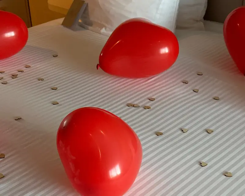 Maak je verblijf extra bijzonder met een romantische verrassing op je kamer. Ons Romantisch Pakket zorgt voor de perfecte sfeer: hartjesballonnen, sierlijke zwaantjes op het bed, heerlijke chocolade om samen van te genieten, en houten hartjes als liefdevolle decoratie. Daarnaast voegen we een gepersonaliseerd kaartje toe, zodat je jouw speciale boodschap kunt overbrengen.